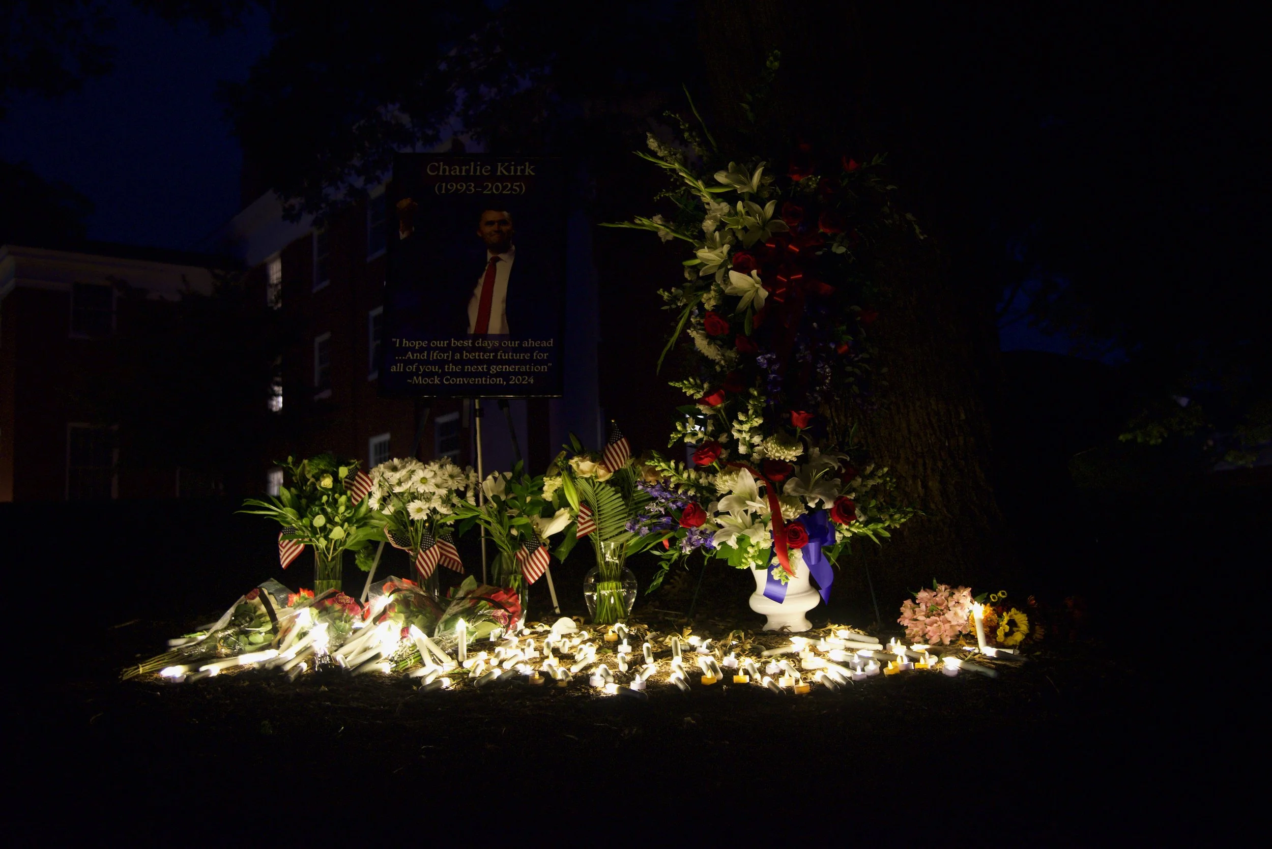 The event ended with Charlie Kirk’s portrait, flowers, and dozens of candles staying overnight on the historic W&L Colonnade.