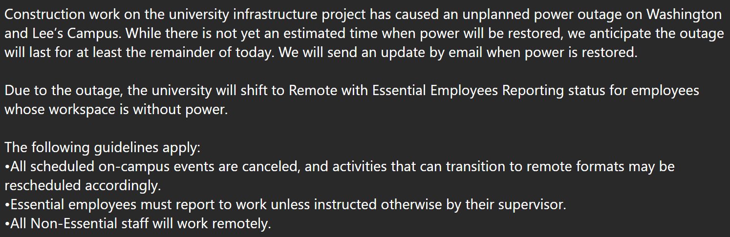 Additionally, The Spectator reached out to W&L’s university architect and W&L Public Safety for comment on the outage, but has not received a response from either.